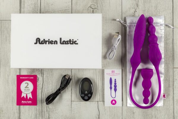 Description:Â Â Adrien Lastic exploring senses. Endless possibilities for couples play. Mini Double ended vibrator with optional removable dildo sheath ideal for couples play! The 2X vibrator can be enjoyed both vaginally and anally. Both ends of the 2X vibrator have different dimensions and separate motors, allowing you to play with the ends separately and feel each unique sensation. Comes with an extra long flexible silicone string between both vibrator allowing multi position! The vibrator can be used solo for simultaneous back door fun and internal stimulation to feel totally satiated, or use the ends separately, or use the 2 vibrator with a partner. Adrien Lastic 2X Double Ended Vibrator is made using latex free, phthalate free 100% super soft silicone. Color Purple. 10 speeds. 2 motors. Integrated battery and charger. 22.6 inches in length by 1.3 inches and 1.1 inches in diameter.USB rechargeable. USB charging cord included. Remote control included. 2 year warranty. Added image and video 19.