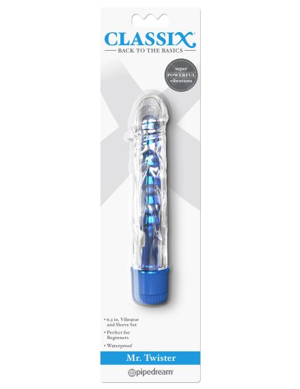 Description:  Classix Mr. Twister Blue Metallic Vibe with Thermoplastic Elastomers Sleeve from Pipedream Products. With his crystal clear sleeve and shiny metallic insides, Mr. Twister is the right man for the job! Turn the dial on the multi-speed base and let the powerful vibrations whisk you away! The soft, body safe sleeve has a veiny swirl texture, lifelike head, and tiny ticklers for extra stimulation. Best of all, the removable sleeve can be used as a penis extension and the beaded vibe can be used alone for vaginal or anal play. Cleanup is a snap after the fun with toy cleaner and warm water. Features: perfect for beginners. 6.5 inches Vibrator and Sleeve Set. Waterproof vibrations. Vibrator requires 2 AAA batteries, not included.