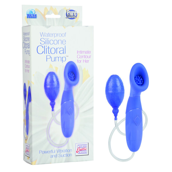 Description:  Waterproof Silicone Clitoral Pump Purple Intimate Contour for her. Designed for a woman by a woman. Advanced waterproof Silicone female pump with powerful vibration and superior suction. 3 intense speeds of vibration. Easy push button control. Easy squeeze bulb and quick air release valve. Waterproof for play in and out of the water. Safe and pure for body and pleasure. Made using phthalate free, non-toxic materials: Silicone sleeve, bulb, button, ABS plastic pump, release valve, PVC hose. Female pump measures 7.75 inches overall by 2.5 inches wide suction cup. Bulk weight 6.2 ounces. Vibrating clitoral pump requires 2 AAA batteries, not included. Do not leave batteries in the vibrator between uses. Always clean before and after use. Category: For Women, Vibrators, Stimulators. Waterproof Silicone Clitoral Pump is a registered trademark for California Exotic Novelties. Sex toys and sexual wellness. Colors may vary. New for 2013 package front and back. Located on the back side of the product in five different languages to help describe the adult products to the customer: English EN, Dutch DE, French FR, Spanish ES and Russian RU.
