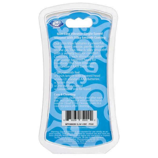 Description:Â Â Cloud 9 Slimline Vibe Pink. Slimline Vibrator is a single speed with a silky smooth coating. Cloud 9 Slimline Vibe features a powerful, single speed motor, perfect when on the go. This vibe is silky smooth with a velvety feel for comfort. Compact, 5 inches stimulator with a sensuous tapered head for insertion. The Slim Vibe uses 2 standard AAA batteries. Features: silky smooth feel. 5 inches length with tapered head. Vibrator requires 2 standard AAA batteries, not included. Splash Proof for shower use only. One button control. Convenient size for travel. Care and cleaning: thoroughly clean before and after each use. You can wash vibrator with antibacterial soap or Cloud 9 Toy Cleaner. Store in a cool dry place after cleaning.