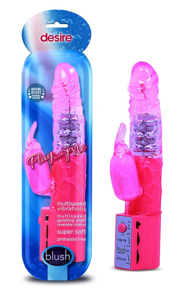Description:  Blush Novelties Play with Me series Desire Pink Rabbit Vibrator. Are you longing for a surge of sexual desire that just makes your toes curl? Well, this multiple speed Desire Vibe by Blush Novelties was made to fulfill your sexual appetite! While the shaft silently rotates beads up and down, as the clitoris stimulator vibrates you into a frenzy. Blush Novelties newest version of the Desire is a well made economical vibrator. Made with a revolutionary new material is non-porous so it will not harbor bacteria. The shaft rotates silently and is independently controlled.There is no product on the market that offers this much quality and value for this price. New lower price. Rabbit vibrator features multiple speed rotating beads and shaft. Reversible rotating shaft. Multiple speed clitoral stimulator. Made using phthalates free, non-toxic materials Thermoplastic Rubber TPR shaft, clitoral, ABS plastic base. These materials are non-porous and will not harbor bacteria. Easy to operate with its independent controls. Economical priced dual purpose sex toy with an overall length of 9.5 inches, an insertable length of 5.5 inches and a circumference of 4.75 inches around. Product dimensions: Length 9.5 inches. Insertable 5.5 inches. Width 1.5 inches. Circumference 4.5 inches. Bulk Weight 9.4 ounces. Vibrating sex toy requires 4 AA batteries, not included. Do not leave batteries in the vibrator between uses. A water based lubricant is recommended. How to use: power and motion insert 4 AA batteries. Twist dial on controller. Cleanse and care run water and apply a mild soap or wipe with a choice toy cleaner. Then let air dry. 2014.