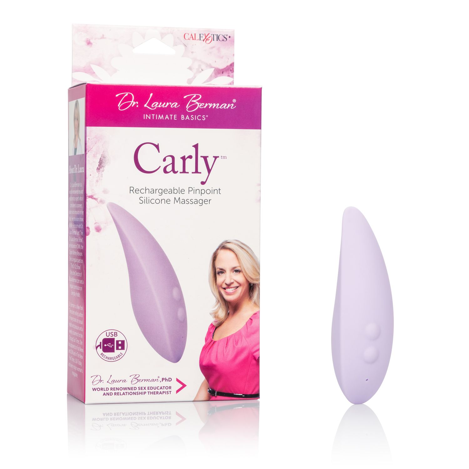 Description:Â Â Dr Laura Berman Carly Rechargeable Pinpoint Silicone Massager from Cal Exotics. Dr Laura Berman is a world renowned sex researcher, relationship educator and best selling author. Dr. Berman has helped countless couples improve their sex lives and build stronger relationships. The Dr. Laura Berman Carly Pinpoint Silicone Massager is a teasing compact vibe for your next pleasure filled adventure; Spiral towards full body stimulation with 10 vibration functions, a unique curved body and silky silicone. Fit this mini massager perfectly in your palm and enjoy full control over the indulgent vibrations and versatile massager shape. Indulge personalized pleasure with 10 vivacious vibration, passionate pulsation and erotic escalation. The ultra smooth curved shape is covered in a premium silicone with two sleek profile buttons. Hold the silky push touch button for 3 seconds to turn on/off. Whether you are getting steamy in the tub or getting cozy with your lover, control the variety of orgasmic options with the waterproof easy touch button. Whether you are taking a dip with a lover or indulging in a steamy solo session, look forward to up to 1.5 hours of waterproof vibration. Recharge pleasure and get back to playtime in only 2.5 hours with the provided USB cable. Specifications Color Lavender. Materials Silicone. Power source USB Rechargeable, included. FeaturesPhthalate Free, Waterproof, Rechargeable, Vibrates. 90 day warranty. Maximum run time90 minutes. Maximum charging time 150 minutes. Measurements 4 inches by 1.25 inches massager. Weight bulk 2.5 ounces. Package 3.6 ounces. Package 2 inches by 4 inches by 8.5 inches.