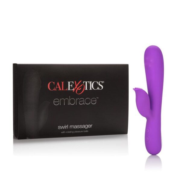 Description:Â Â Embrace Swirl Massager Purple Rabbit Style Vibrator. Maximize your pleasure with full coverage that brings ecstasy with ease. You will get everything you need to find exactly what you desire. Elegantly designed for the ultimate in gratification. Revel in the luxurious feel and the pure pleasure you will achieve. For the ultimate in gratification, independent controls allow you to set each feature. Get exactly what you need to find just what you crave. Get ready for a mind-blowing orgasm! Not just your average dual stimulator, the embrace swirl massager also offers the most intense G-spot stimulation on the market! With seven seductive functions to tickle your clit plus seven oh my goodness functions of swirling pleasure beads at the tip of the shaft, your G-spot will be screaming, more, more, more! Each feature is operated independently by simple press button control. This means a perfectly customized experience for each and every wanting body. Try out each function to find your favorite. Let the hum of the clitoral stimulator throb against you in a perfect pattern. When you are ready for more, indulge in the four synchronously swirling beads spinning at your favorite rhythm and speed. Your new favorite toy is also rechargeable via the included USB cord. With a quick charging time and extended run times, you will not be left waiting around or wanting more. Formed in body safe silicone that makes cleaning a breeze, rest easy knowing your product is hygienically superior. Personal fun reaches a whole new level with this power packed little toy. Its perfectly sized and ready to rock your world. Always remember to wash your toys with warm soap and water or your favorite adult toy cleaner before and after each use. Waterproof vibrations. USB rechargeable. 75 charge time. 70 minute maximum run time. 1 year warranty.