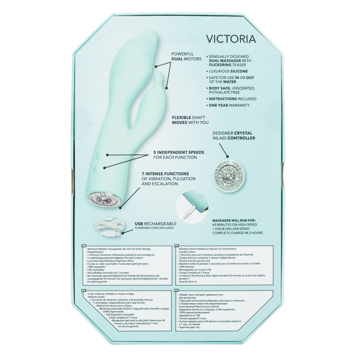 Description:Â Â Jopen Pave Victoria Rabbit Style Vibrator from California Exotic Novelties. The marvelous Pave Victoria is a dual rabbit massager with dazzling crystal adornments, flexible teaser and 35 sensational vibration settings for a truly luxurious pleasure experience.The contoured teaser tip and sensual shaft are perfect for caressing internal and external sweet spots. For an ultra smooth surface and flexible body, the curved stimulator and massager are covered in a premium Satin Finish Silicone. This silky smooth vibrator is packed with 7 functions of vibration and 5 independent speeds for each function for stimulation made just for you. The easy touch control buttons let you effortlessly flicker through each function of vibration, while increasing or decreasing the function intensity. Whether youre taking a dip with a lover or indulging in a steamy solo session, look forward to up to 1 hours of waterproof vibration. Recharge pleasure and get back to playtime in only 2 hours with the provided USB cable. The hypoallergenic luxury teaser is made from Satin Finish silicone with glass crystal adornments. Specifications: Color Teal Green. MaterialsSilicone. Power source USB Rechargeable, included. Features Phthalate Free, Waterproof, Rechargeable, Vibrates. Allergens N/A. 1 year warranty. Maximum run time 40 minutes. Maximum charging time 120 minutes.
