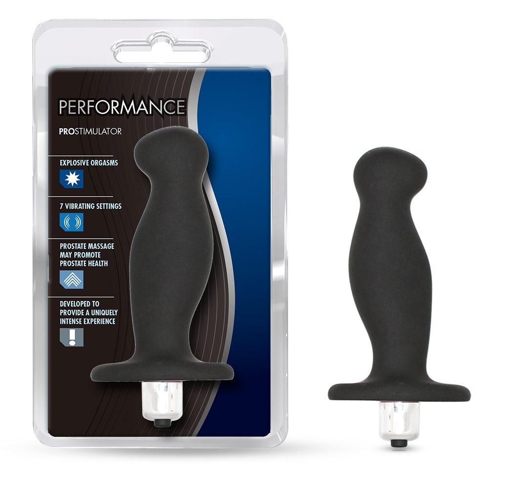 Description:Â Â Blush Novelties Performance exclusive toys for big boys. High quality luxury adult toys for every body type and feel. Blush Novelties exclusive product line will blow you away. Prostimulator Black is an instrument of simplicity, Prostimulator exhibits a modern design. Prostimulator is a gender neutral vibrator for precise P-Spot or G-Spot stimulation. Prostimulator palpitates your erogenous zones with seven vibration settings: three vibrating speeds and four pulse patterns. Smooth to the touch and silent to the ear, Prostimulator transfers vibration throughout the unit helping the user achieve intense orgasms. Made of pure body safe silicone, Prostimulator is boil proof and freeze proof for sensual temperature play and hygiene. Remove bullet vibrator prior to cooling or heating. Specifications: 10 vibrating functions. Waterproof vibrations. Unique shape for prostate stimulation. Silicone. Smooth satin finish. Phthalates and latex free. Requires 1 AAA battery. Batteries included. Length: 5 inches. Insertable 4 inches. Width 1.3 inches. Circumference 3.75 inches. Bulk weight 2.6 ounces. How to use: prepare by applying a water based personal lubricant to anus and prostimulator. Power and motion remove tab. Push the button on the bottom of the cap. Motion II press end against anus. Guide inside. Remove with base. Cleanse and care remove bullet. Run water and apply a mild soap or wipe with a choice toy cleaner. Let air dry. Cleanse and care II remove bullet vibrator first. Bring water to rapid boil. Remove from heat. Place silicone toy in water for five minutes. Remove and let air dry. 90 day warranty from Blush Novelties. 18