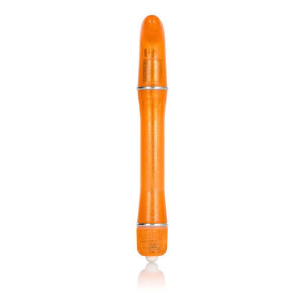 Description:  Calexotics Pixies Mini G Orange Vibrator. Power packed petite waterproof vibrating massager with curve to zone in on the G-spot pleasure zone. Made with durable and easy to clean plastic, this massager has a sparkling shimmer while the contoured shape supplies total stimulation. The wand-like design makes it easy to control and grip. A single push-button activation directs the vibrations and the waterproof construction makes it fun in the shower or bath. Total length is 5.75 inches with an insertable length of 5 inches. Vibrator measures 5 inches long by .75 inch wide. Bulk weight 0.90 ounce. Vibrating sex toy requires 2 AAA batteries not included. Do not leave batteries in the vibrator between uses. A water based lubricant is recommended. Always clean before and after use. Category: For Women, Vibrator, Vibrators. Pixies Vibes hold the US Patent # D450952. Waterproof Pixies Mini G Vibe is a registered trademark for California Exotic Novelties. Sex toys and sexual wellness. 16.