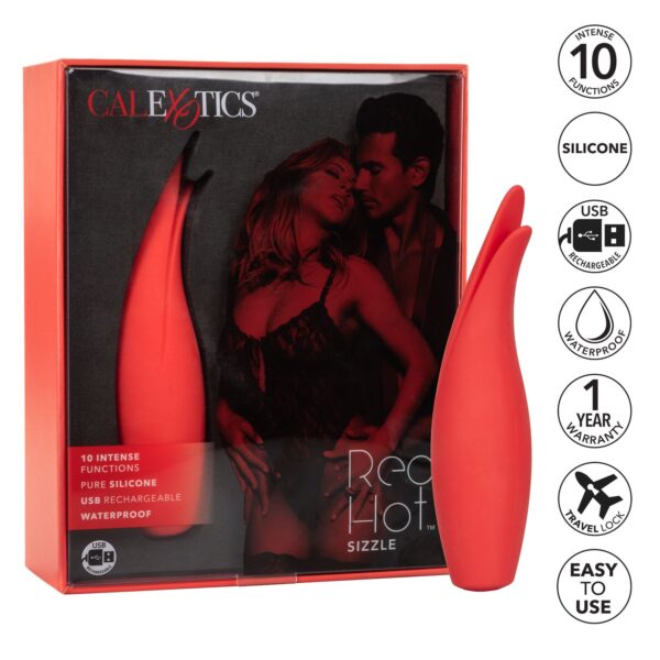 Description:  Red Hot Sizzle Clitoral Massager from Cal Exotics. The Red Hot Sizzle is sure to light a fire in your love life with the elegantly curved teaser and 10 powerful vibration functions. The compact travel size, 100% play area and unique body make for a blazing good time. The elegantly curved teaser and 100% play area were crafted to perfectly caress your most sensual sweet spots and deliver fluttering stimulation. The flickering tips and compact size deliver pinpoint pleasure, anywhere you go. Indulge personalized pleasure while the curved massager shimmies to the rhythm of 10 vivacious vibration, passionate pulsation and erotic escalation. Control this variety of orgasmic options with the easy touch button and fan the flames of passion. Whether you are taking a dip with a lover or indulging in a steamy solo session, look forward to up to 3 hours of waterproof vibration. Recharge pleasure and get back to playtime in only 2.5 hours with the provided USB cable. The flexible vibe is made from a hygienically superior silicone. This body safe material is unscented and phthalate free to keep your most sensitive spots happy and healthy. Specifications: color Red. Materials Silicone. Power source USB Rechargeable, included. Features Phthalate Free, Waterproof, Rechargeable, Vibrates. 1 year warranty. Maximum run time 180 minutes. Maximum charging time 150 minutes. Measurements 5.25 inches by 1.25 inches massager. Bulk weight 2.3 ounces. Package 9.2 ounces. Package 2.25 inches by 5.25 inches by 6.5 inches.