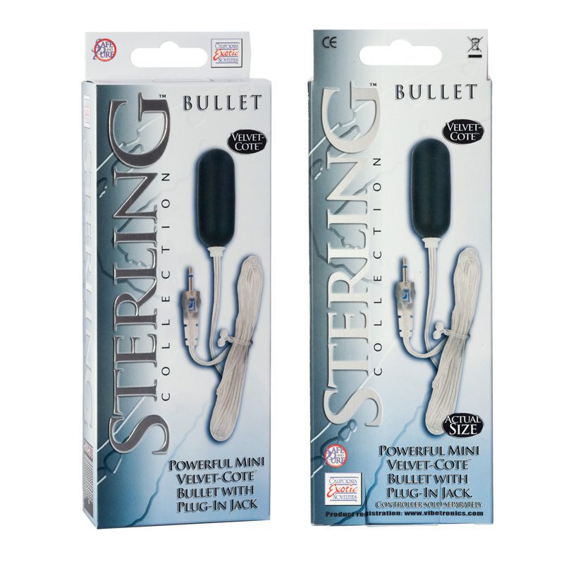 Description:  Sterling Collection Mini Velvet Bullet comes with a cord plug-in jack. Bullet vibrator is made using phthalate free, non-toxic materials ABS plastic with Velvet-Cote Polyurethane PU Cote. Please note this item does not come with a power supply or controller. Sold separately. Bullet vibrator measures 1.5 inches long by .75 inch wide. Bulk weight: .8 ounces. Always clean before and after use. Category: For Women, Bullets, Beads & Balls, Bullets. Sterling Collection Mini Velvet Bullet is a registered trademark for California Exotic Novelties. Sex toys and sexual wellness. New high resolution images added.
