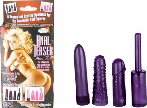 Description:Â Â Anal Teaser Kit Purple Powerful classic mini vibe. Includes 3 fun sleeves! Anal tickler, veined penis and nubby studded stimulator. Requires AA batteries, not included. Do not leave batteries in the vibrator between uses. Always clean before and after use. Anal Teaser Kit from Nasstoys of New York. Made in USA.